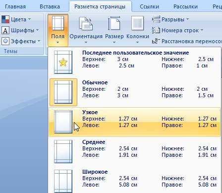 - Перейдите во вкладку “Разметка” –> Поля. Здесь выберите шаблон разметки с узкими полями: