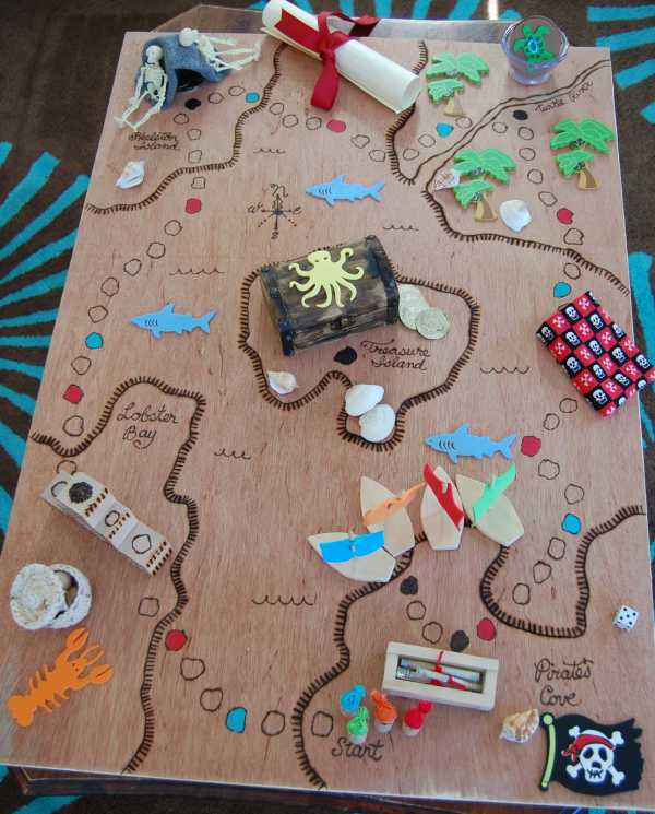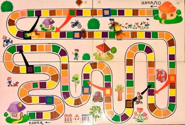 Основной процесс заключается в создании карты. Разложите 8 листов формата А4 в 2 ряда, оставьте промежутки по пол сантиметра, чтобы в дальнейшем можно было сложить карту. Поставьте груз на каждый лист, чтобы он не сдвинулся, затем склейте скотчем листы вдоль каждого ряда. Нарисуйте карандашом маршрут ходов и расположите остановки, например (1-60 или 1-90), между каждой остановкой делайте расстояние 2-3 см. Отметьте бонусные и штрафные шаги, направление укажите стрелочками. Заполните рисунками пустые места на карте. Цифровой кубик можно приобрести в канцелярском магазине либо сделать из картона. В качестве фишек используйте маленькие игрушки киндер сюрприза, пуговицы, маленькие печеньки…