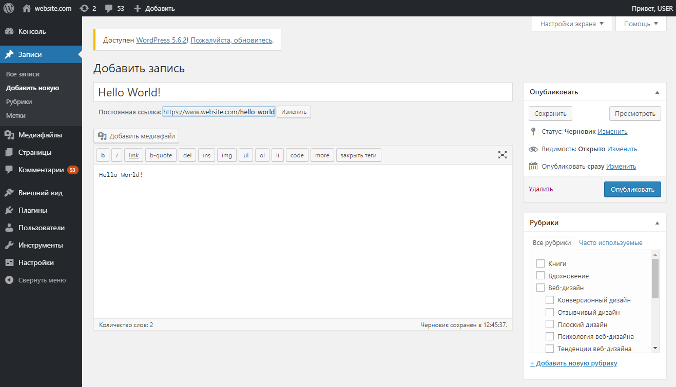 Есть несколько советов, которые следует учитывать при работе с контентом. С правой стороны вы увидите несколько дополнительных опций. Например, установка избранного изображения автоматически устанавливает миниатюру, которая сопровождает сообщения во многих темах.
