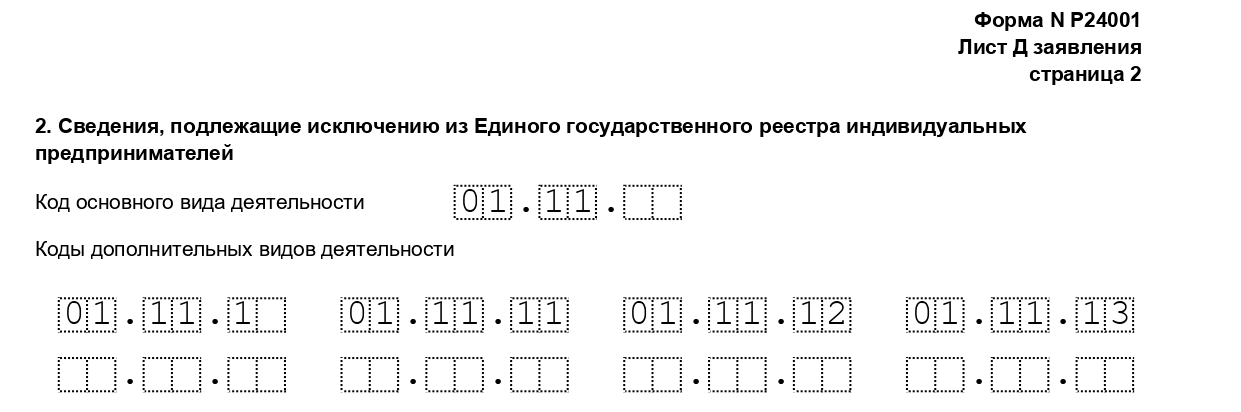 Чтобы изменить вид деятельности, который указан в ЕГРИП, подайте в налоговую заявление по форме Р24001. С помощью этой формы можно изменить как основной вид деятельности, так и дополнительные виды. В любом случае заполнять надо только страницу 001, а также листы Д и Е. Лист Д состоит из двух страниц, но заполнять обе нужно не всегда. Первая страница отводится для добавления нового кода, а вторая — для исключения прежнего.