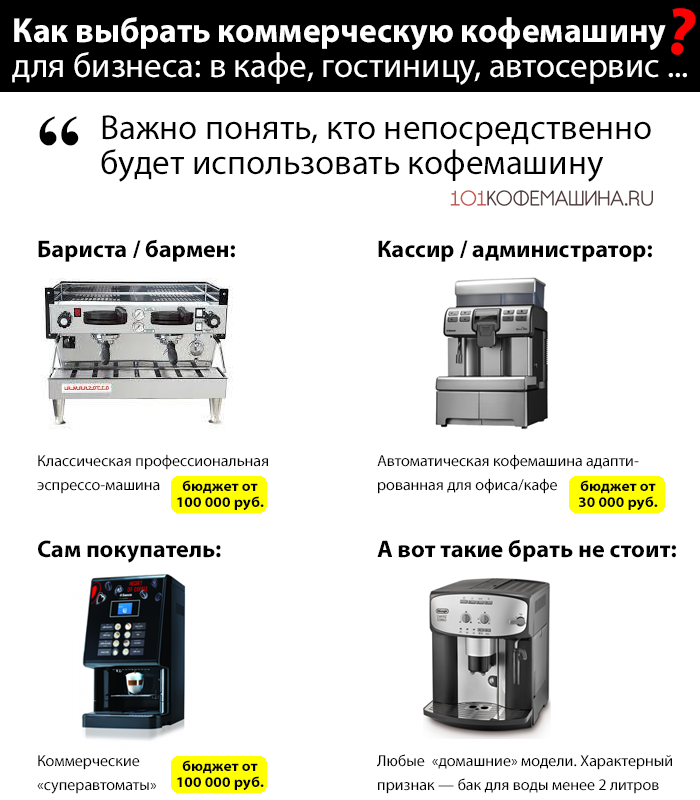 Честно говоря, ответ «это зависит». Машины этой категории могут стоить от 5000 до 40 000 долларов, в зависимости от таких вещей, как количество котлов, групповых головок, паровых трубок, уровня автоматизации, встроенных функций и т. д.Количество клиентов, которых вы обслуживаете, и тип атмосферы, которую вы пытаетесь создать, наряду с множеством других факторов будут влиять на то, сколько денег вы планируете потратить.