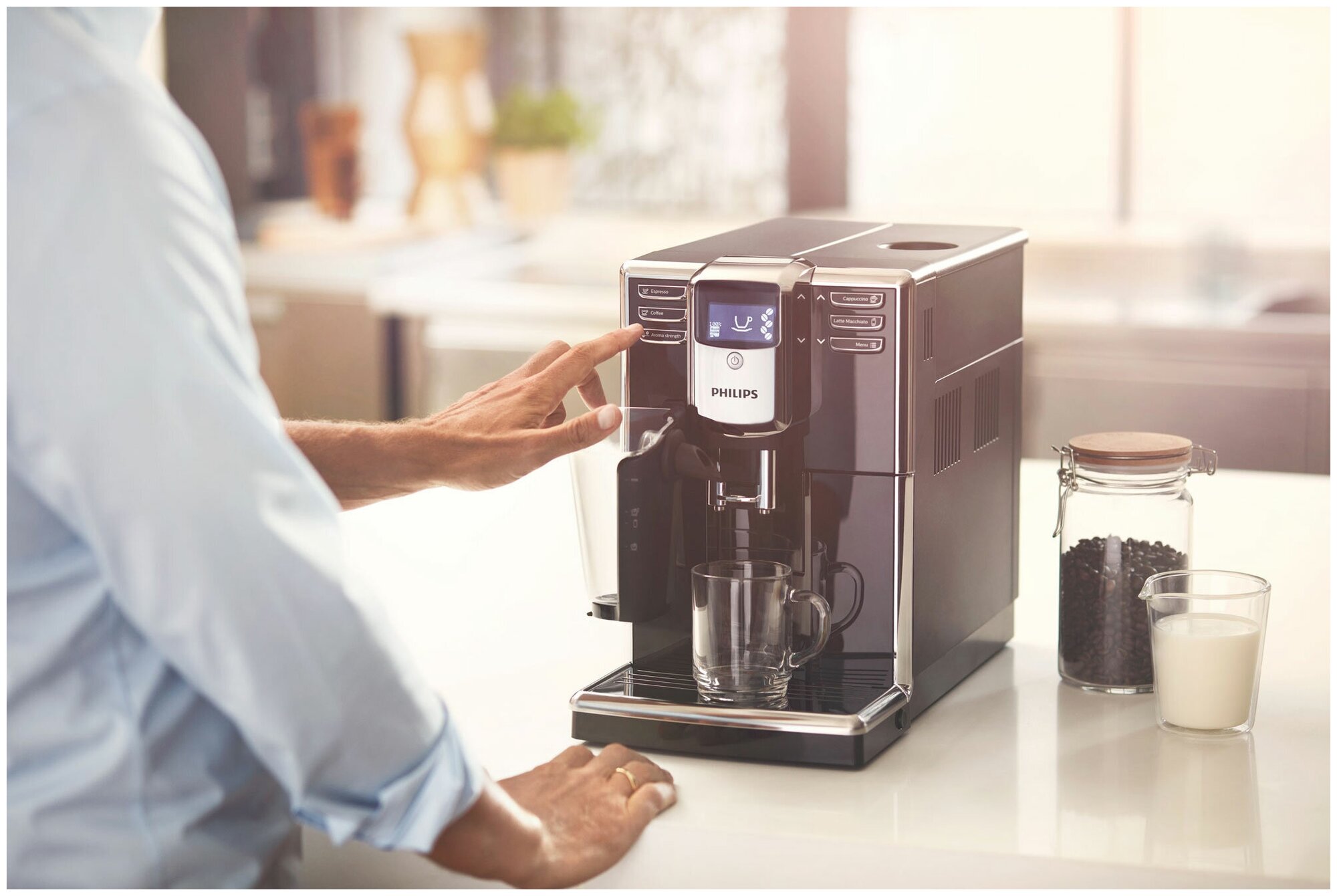 Philips HD8650 2000 Series словно прилетела к нам из космоса. Необычный дизайн привлекает внимание. В данном приборе, работающим с зерном, можно регулировать степень помола кофе. Кофемашина работает сразу с двумя порциями напитка.