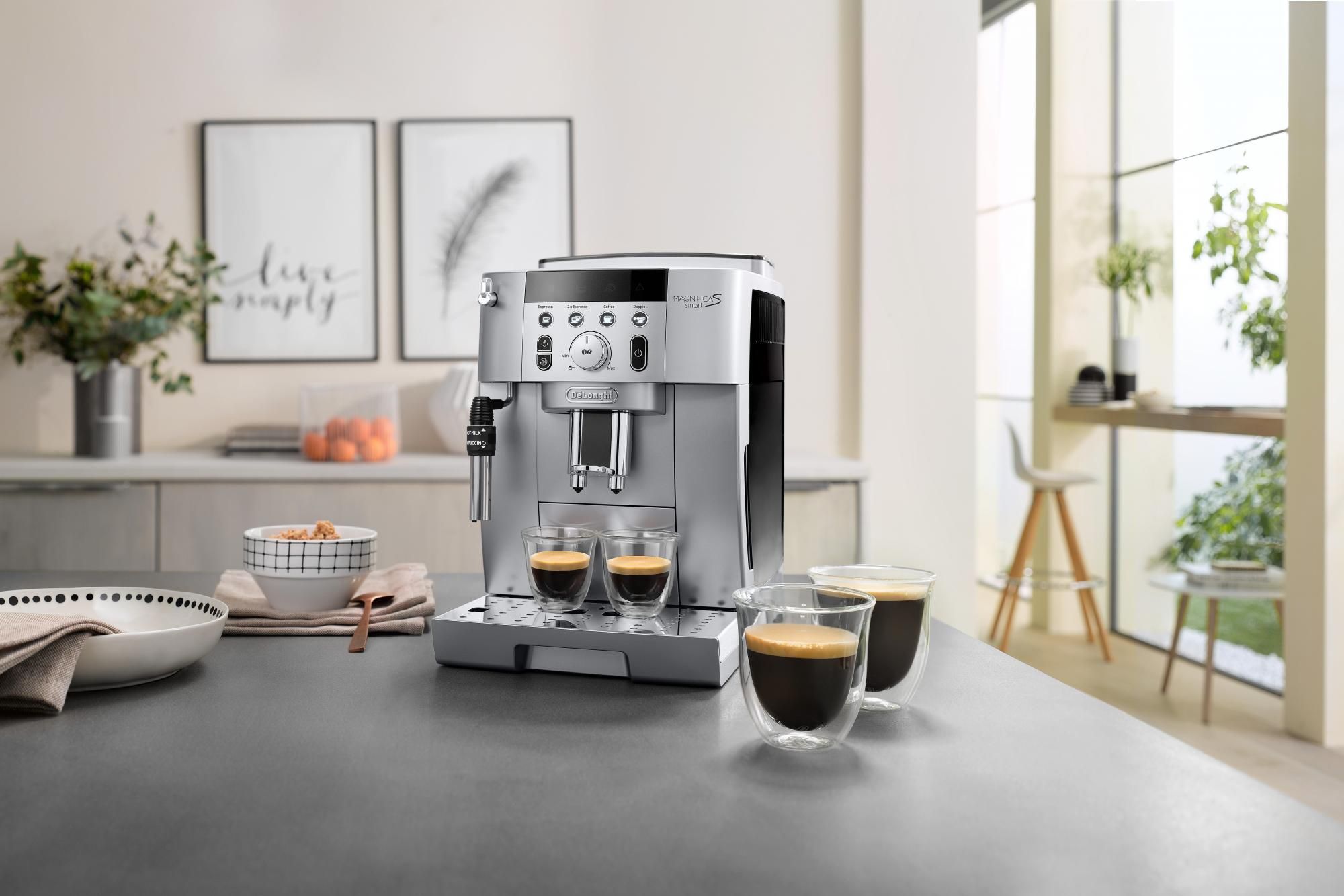 Это более компактная модель, внешне очень привлекательная, впишется в самый стильный интерьер. Несмотря на более компактный размер, число настроек и регулировок также впечатляет. Кофемашина варит и разливает одновременно 2 порции напитка. Процесс приготовления описывается на дисплее на фронтальной панели прибора. Выбор напитков здесь один из лучших.