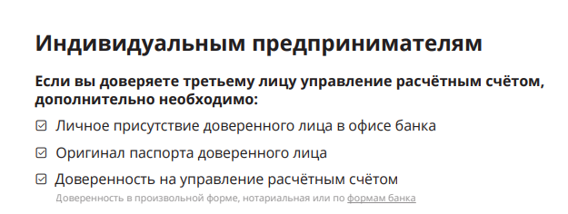 - Паспорта предпринимателя; лиц, которым доверено управление счётом.