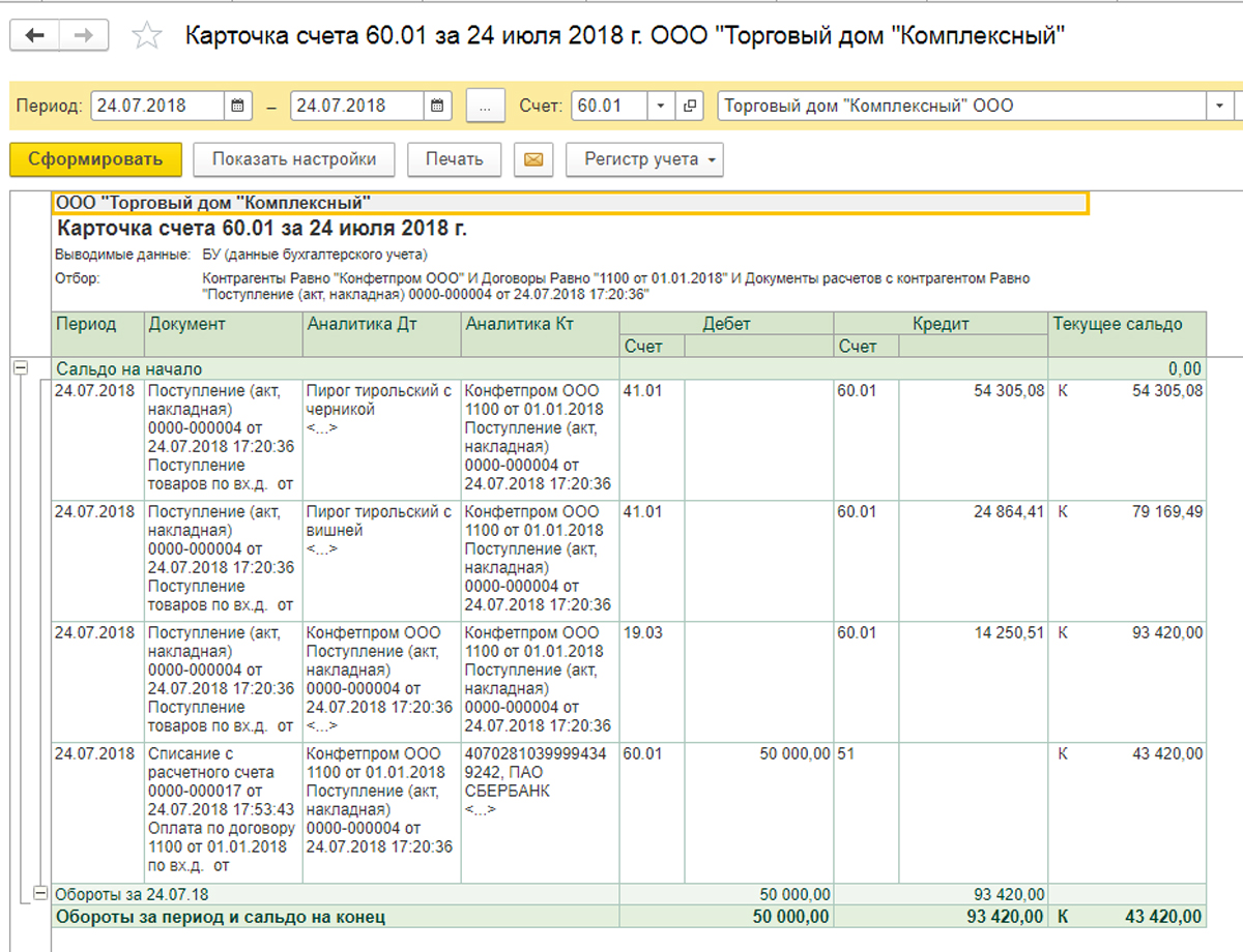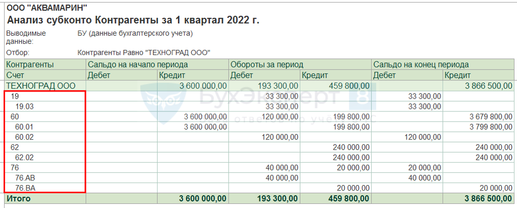 В результате в отчете в колонке «Аналитика Кт» появилась дополнительная строка со значением ИНН поставщика товара.