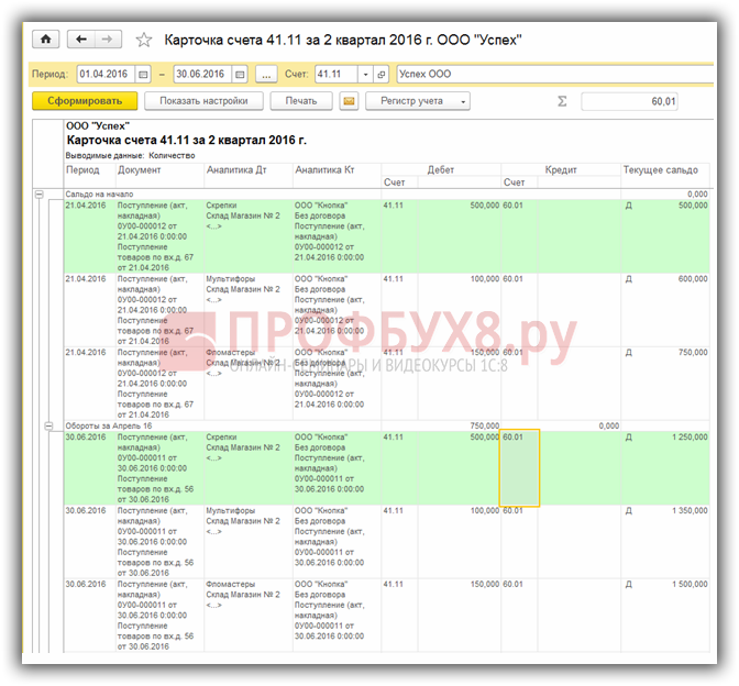 В этом случае у корреспондирующего счета 41 «Товары» появится дополнительная отметка, по которой можно узнать к какой номенклатурной группе относится поставка товара в графе «Аналитика Дт». В нашем примере это «Товары для озеленения, ландшафтного дизайна» и «Основная номенклатурная группа».