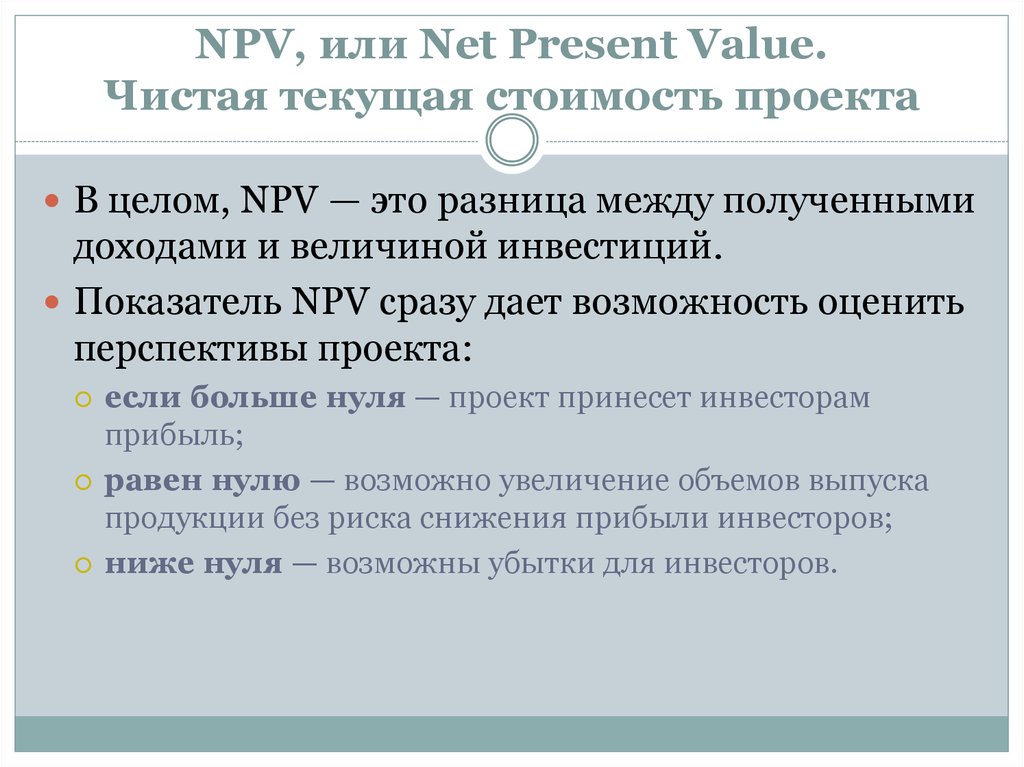 • NPV > 0 – проект принесет прибыль инвесторам;
