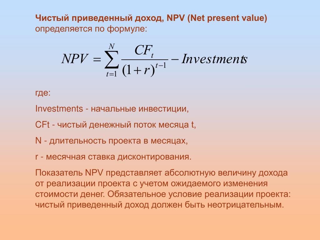 Чистый приведенный доход — это сумма текущих эффектов за весь расчетный период, приведенная к начальному шагу, или как превышение интегральных результатов над интегральными затратами [22, с 147]