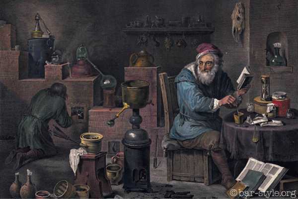 Алхимия уносит нас в тот период, когда все представлялось возможным. Казалось достаточным разгадать загадки предков, произнести несколько заклятий, разогреть добела металл, полить его ртутной жидкостью и остудить все это в полнолуние, чтобы получить золото и обрести бессмертие. Но что же все это имеет общего с алкоголем, спиртными напитками и перегонкой? А то, что для получения философского камня — конечной цели алхимиков – было необходимо произвести 12 деликатных операций: обжигание, замораживание, растворение, вываривание, дистилляцию, сублимацию, отделение, испепеление, брожение и, наконец, — наверное, самую важную, но никогда не реализованную процедуру — превращение. Из числа этих операций растворение, брожение и особенно дистилляция позволяют сегодня изготавливать все известные спиртные напитки.