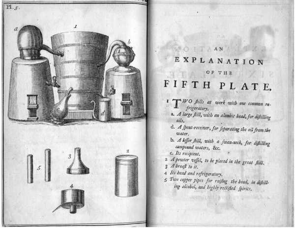 Что касается техники дистилляции, то самым распространенным перегонным аппаратом того времени был аламбик Синезиуса. Он состоял из котла, служившего водяной баней, реторты, содержащей исходный продукт, вытянутого сосуда, в котором скапливались пары, и трубки, по которой они проходили, конденсируясь в емкости-приемнике дистиллята.