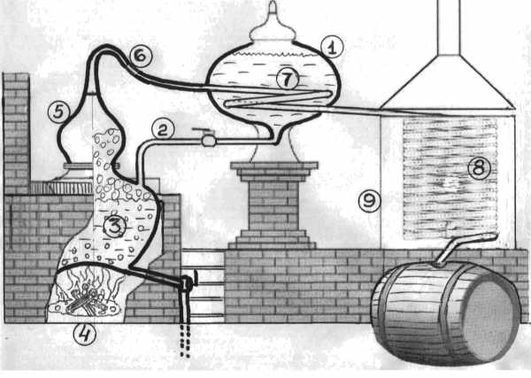 1- Емкость для нагревания вина, 2- Трубка для подачи горячего вина в куб, 3- Перегонный куб, 4- Топка-печь, 5- «Колпак» (chapiteau), 6- «Лебединая шея» (col de cygne), 7- Змеевик нагревания вина, 8- Змеевик конденсации, 9- Емкость с охлаждающей водой.