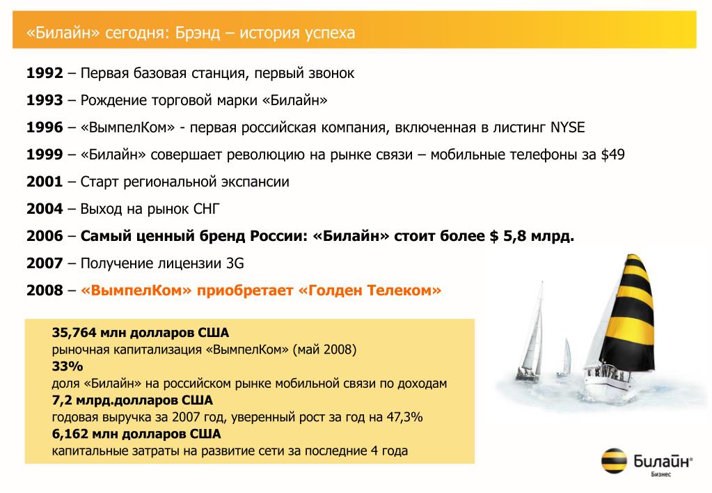 АО «ВымпелКом» было официально зарегистрировано в сентябре 1992 года, а торговая марка «Билайн» – в 1994. Долгое время оператор развивался в пределах Московского региона, и только к началу 2000-х начал активную региональную экспансию: к октябрю 2001 года были охвачены 10 регионов страны, к октябрю 2002 – 30, к декабрю 2003 – 50, к августу 2004 – 70.