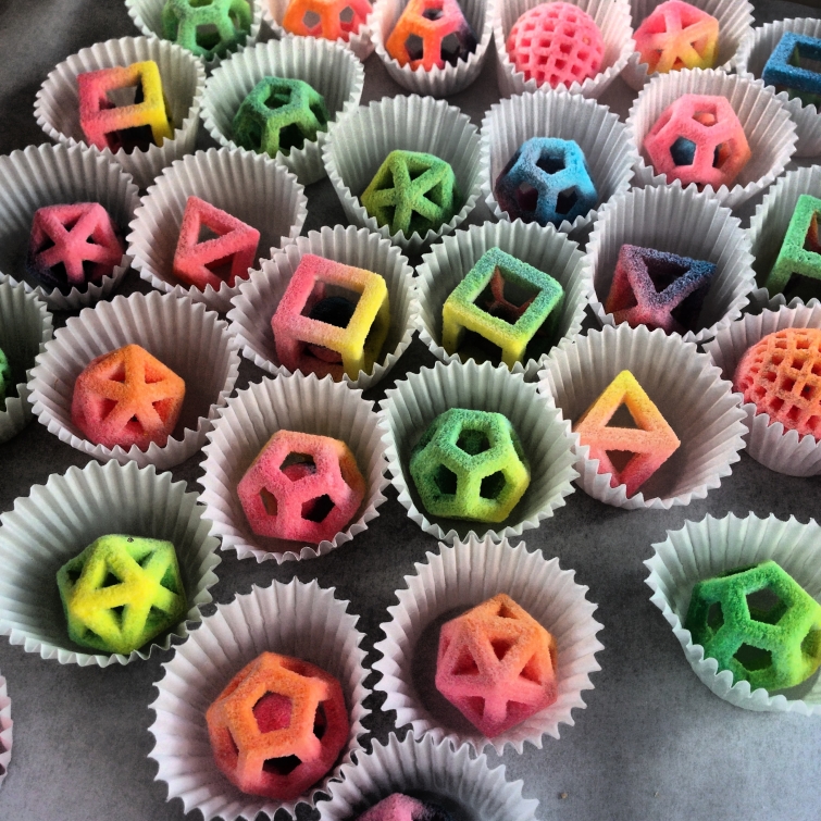 Как и следовало ожидать, применение технологии аддитивного производства позволяет создавать кондитерские изделия исключительно высокой геометрической сложности, недоступной при применении традиционных методов. Возможно даже создание съедобных погремушек – полых конфет, со свободно перемещающейся начинкой разного вкуса.