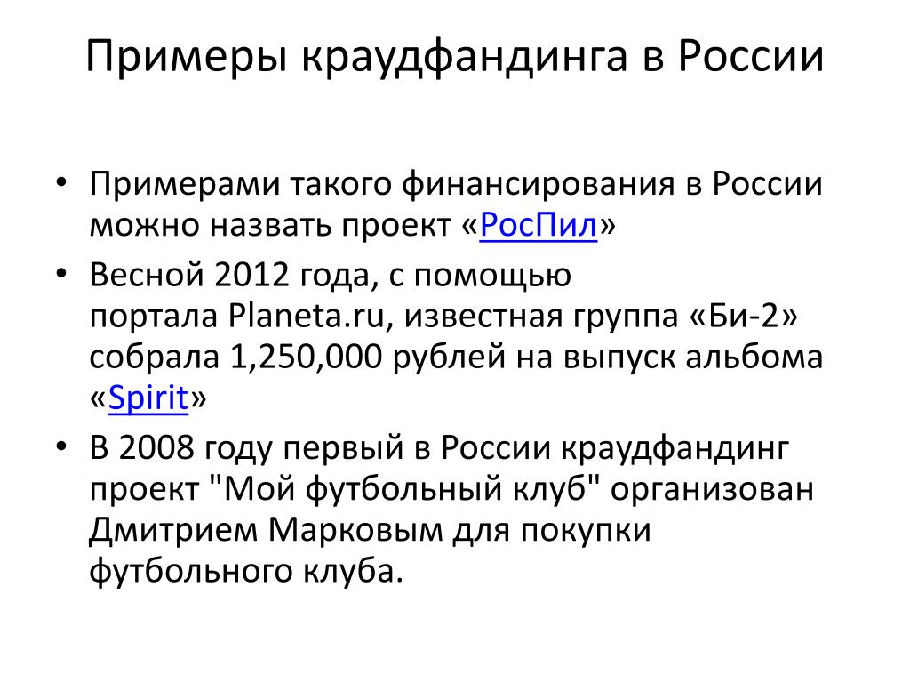 На данный момент в России действуют две краудфандинг площадки — Boomstarter и Planeta.ru. Совместные покупки в рунете обычно представлены как в виде сервисов (100sp, SitePokupok), на форумах и в группах в соцсетях.