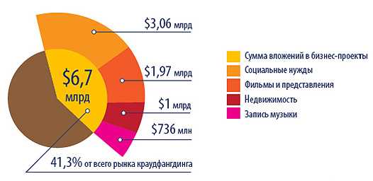 На выше представленном рисунке можно видеть в какие сферы вкладывали свои деньги люди еще пару лет назад. На сегодняшний момент ничего не изменилось. Так, социальные нужны и бизнес-проекты – это два самых распространенных направления в инвестировании по способу краудфандинга.