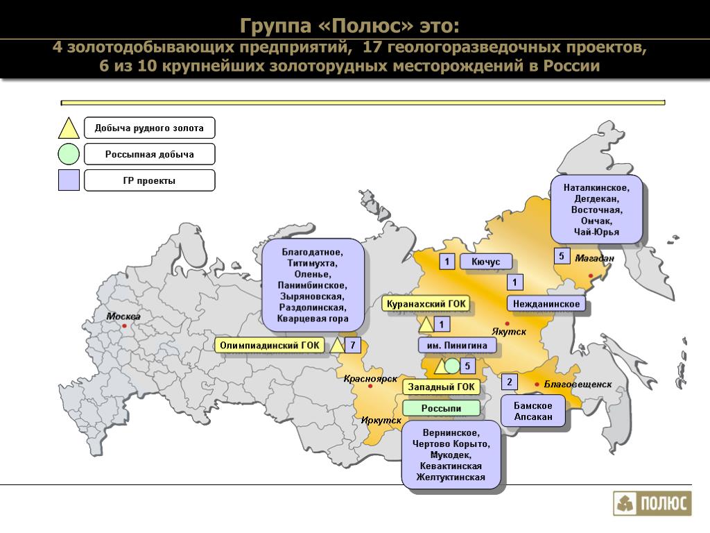 Считается одной из крупнейших компаний по добыче Au. Прежнее название – «Полюс Золото». Главный офис находится в Москве. Год начала существования – 2006. Сегодня это группа компаний, с момента объединения нескольких организаций она наращивает обороты. В основу предприятия легла одноименная артель старателей – «Полюс».