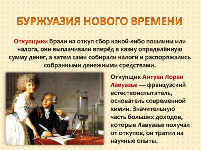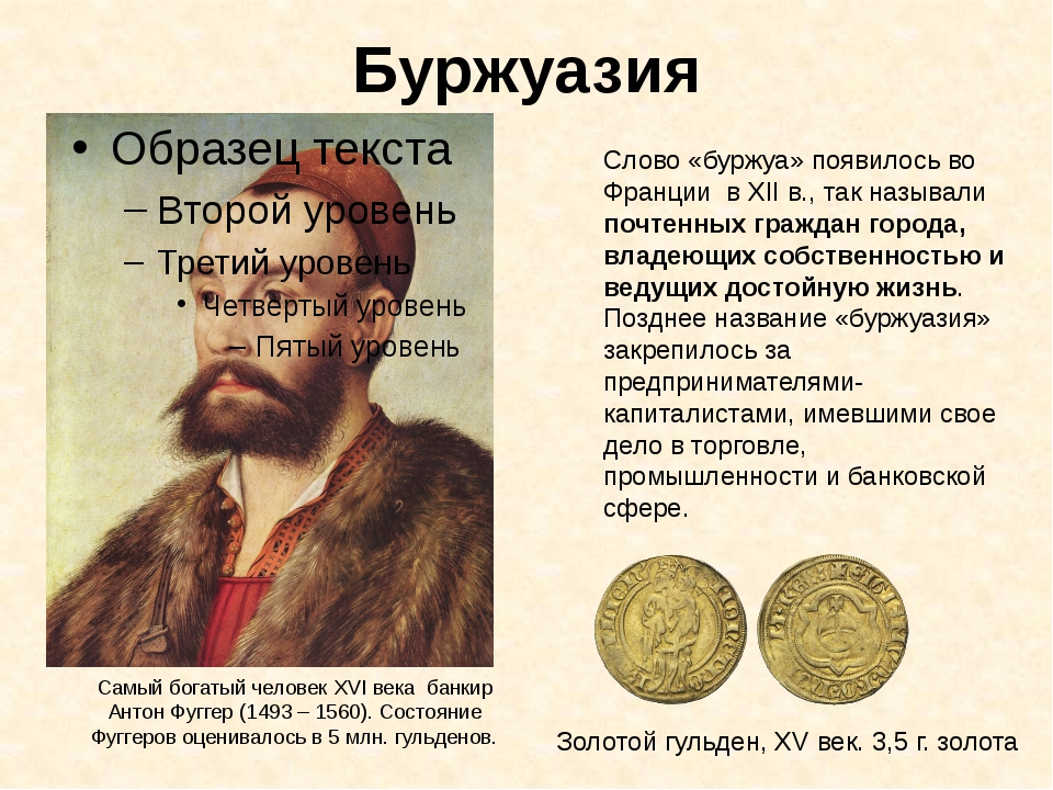 | 1. Буржуазия Нового времени | Развитие предпринимательской деятельности увеличивало численность и богатство буржуазии. Верхушку буржуазии к середине XVII в. составляли купцы, ведущие международную торговлю, крупные банкиры и откупщики. откупщики брали на откуп сбор какой-либо пошлины или налога. Они выплачивали вперёд в казну определённую сумму денег, а затем сами собирали налоги и распоряжались собранными денежными средствами. |