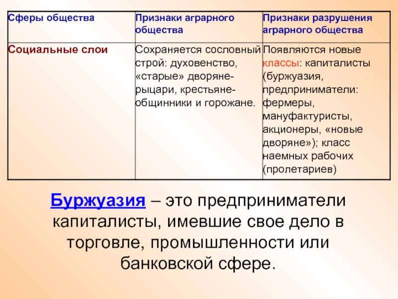 | Капиталисты-предприниматели | Численность и их богатства увеличились. Они имели своё дело в торговле, промышленности или банковской сфере. В XIX веке их назвали «буржуазией» |