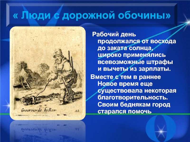 | 4. «Люди с дорожной обочины» | Росло богатство, но рядом с ним и бедность. В XVI в., когда появилась потребность в наёмном труде, толпы бродяг на дорогах вызывали у предпринимателей ненависть. В XVI в. в Англии издавали такие жестокие законы против бродяг, что народ назвал их «кровавыми». Каждый желающий имел право насильно превратить бродягу в своего работника. Сбежавшего, но не пойманного бродягу клеймили. |
