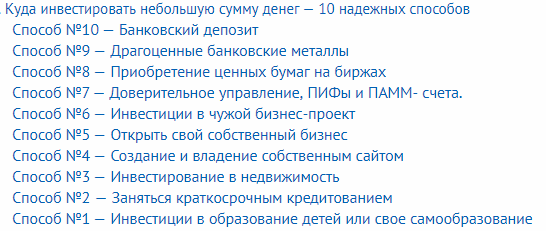 Я буду рассматривать 6 способов, которые лично мне кажутся наиболее выгодными. На самом деле, их гораздо больше. И я очень рекомендую не вкладывать средства во что-то одно, лучше постепенно находить дополнительные варианты и формировать инвестиционный портфель.