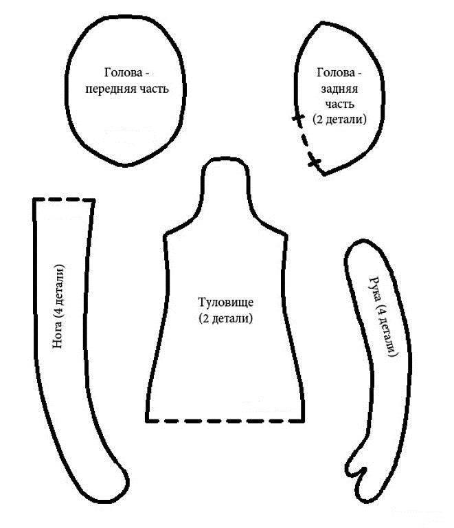 Для этих целей нужно будет подготовить такую же ткань, как и для предыдущего образца, а также акриловые краски для росписи лица. Материал для шевелюры может быть различным, начиная с толстых ниток для вязания и заканчивая специальными искусственными волосами. Самым главным компонентом для создания такой поделки является, конечно же, выкройка, одна из которых изображена ниже.