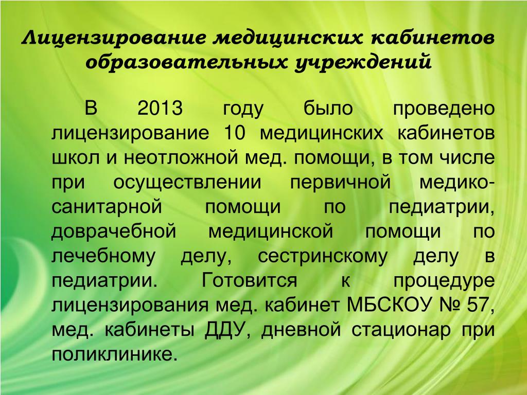 Эксперты компании «МедКонсалтинг» предлагают профессиональную помощь в лицензировании медицинского кабинета для лечения или предоставления консультационно-диагностических услуг. Расскажем обо всех нюансах и требованиях, поможем составить и оформить пакет документов, дадим рекомендации по приведению помещения в соответствие с действующими правилами и нормами. Предлагаем получение лицензии на медицинский кабинет под ключ.
