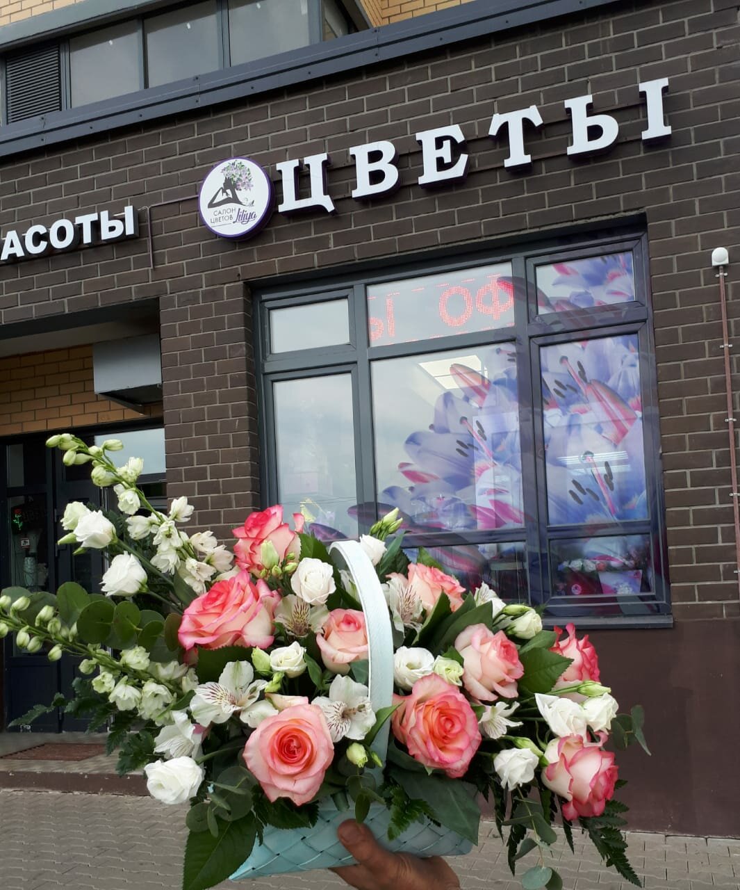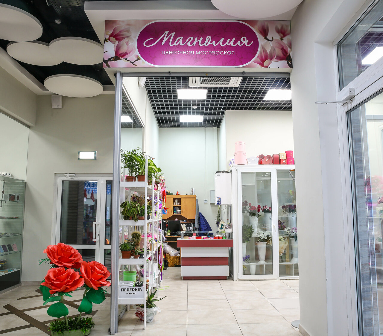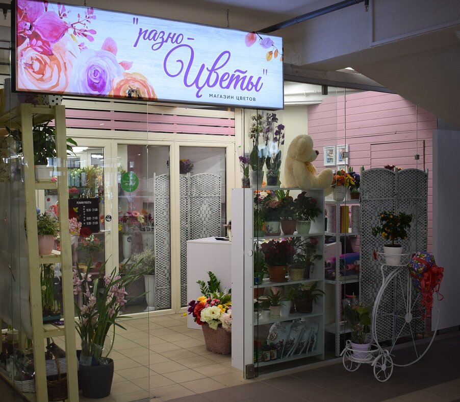 - Исходите из формата торговой точки. Если для небольшого павильона у метро достаточно заметной световой вывески «Цветы», то для цветочного салона с авторскими букетами такой вариант не подойдет.