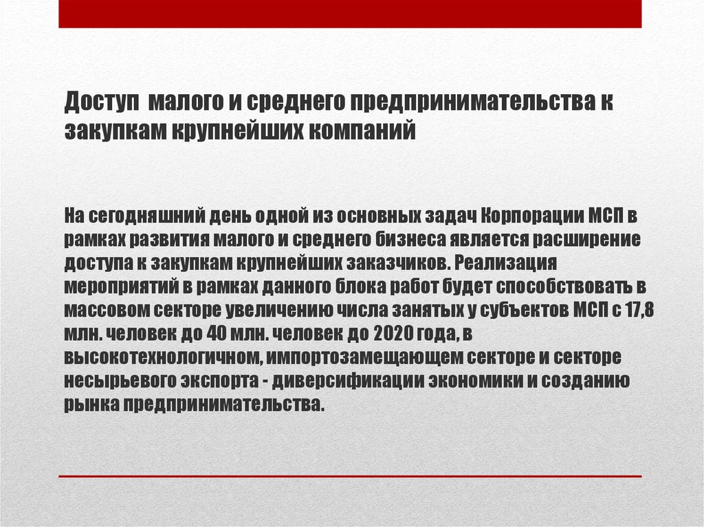 АО «Корпорация “МСП”» совместно с крупнейшими заказчиками проводит мероприятия, направленные на расширение доступа субъектов МСП к закупкам, а также повышение информированности субъектов МСП о функционале портала Бизнес-навигатора МСП, в котором консолидирована сводная информация о мерах государственной поддержки субъектов МСП.