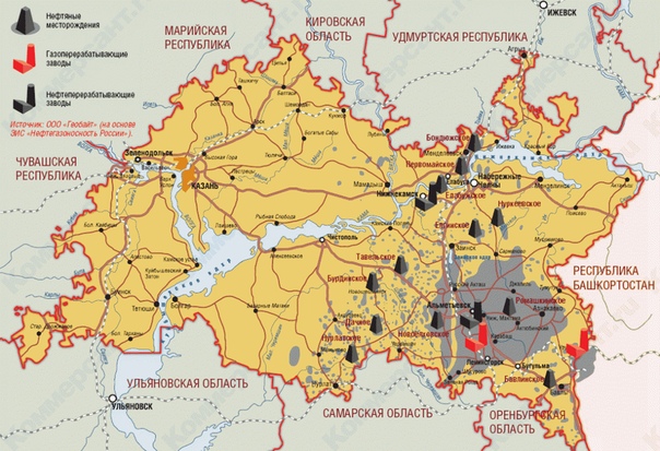 Туймазинское нефтяное месторождение. Это месторождение расположено в Республике Башкирия, у города Туймазы. Месторождение было открыто ещё в 1937 году. Нефтесодержащие слои расположены на глубине 1-1,7 км. Разработка месторождения началась в 1944. Туймазинское месторождение является одни из пяти крупнейших месторождений в мире по количеству нефти.
