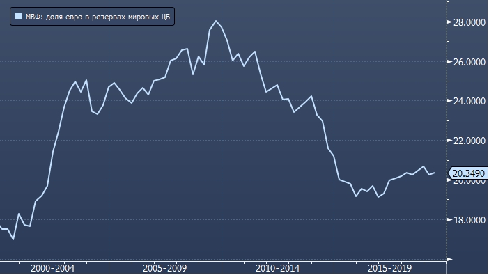 Второе место по доле в резервных фондах занял евро, хотя его доля в три раза меньше, чем у доллара. Чуть более 20% мировых резервов номинированы в европейской валюте. Это примерно 2,28 триллиона долларов.