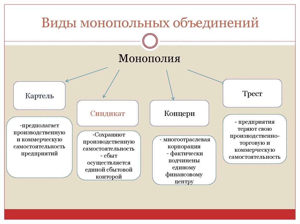 Синдикат – объединение нескольких компаний из одной отрасли, в результате которого сохраняется контроль каждой из них над собственными производственными мощностями, но коммерческая деятельность осуществляется по согласованию сторон. Как правило, для упрощения функционирования создается общий департамент сбыта.