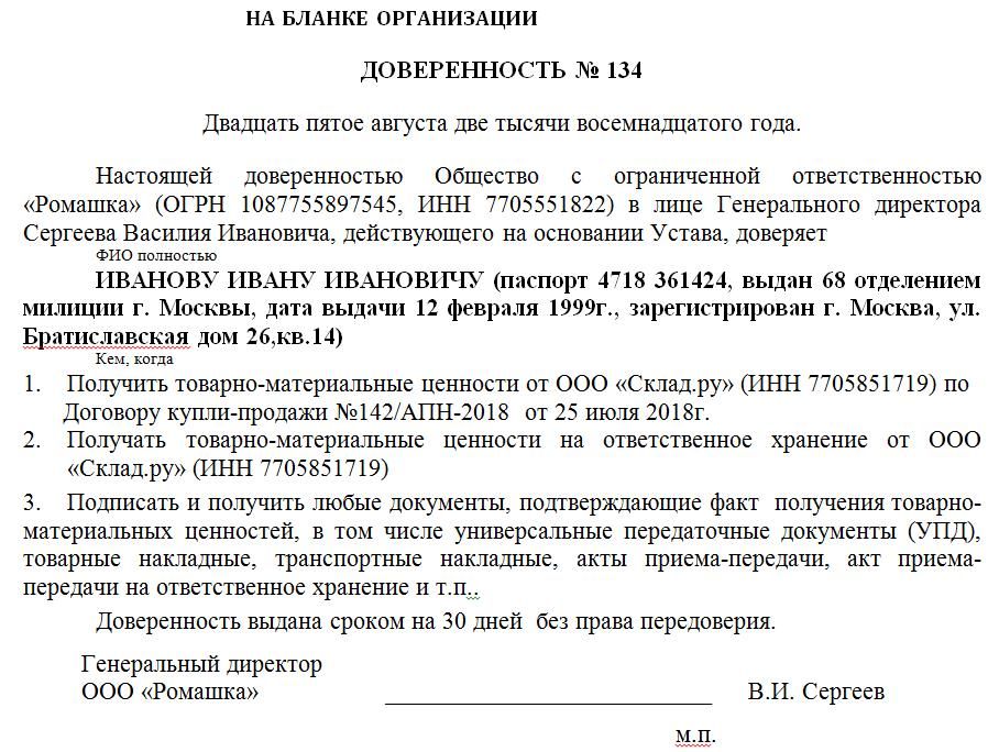 Если документ оформляется между юридическими лицами, то необходимы наименование, ИНН и местонахождение организации. Подпись доверителя — главный атрибут, подтверждающий официальность документа. От юрлиц в таком случае требуется печать и подпись руководителя.