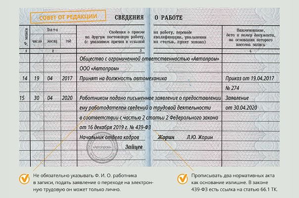 Также обращаем внимание, что переоформление действующих трудовых книжек не требуется. Если новый работник принесет вам трудовую книжку образца 2003 года или более ранних образцов (например, работник представит трудовую книжку колхозника), вы должны сделать запись и приеме на работу в предъявленной трудовой книжке. Заводить трудовую книжку на новом бланке не надо.