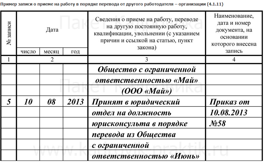 Прием в порядке перевода — запись в трудовой книжке в этом случае выполняется с обязательным указанием наименования прежнего работодателя. Разберем все нюансы заполнения трудовой книжки сотрудника, принятого на работу в порядке перевода и приведем пример записи.