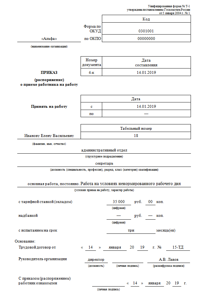 Заполненный образец приказа о приеме на работу 2020 и 2021