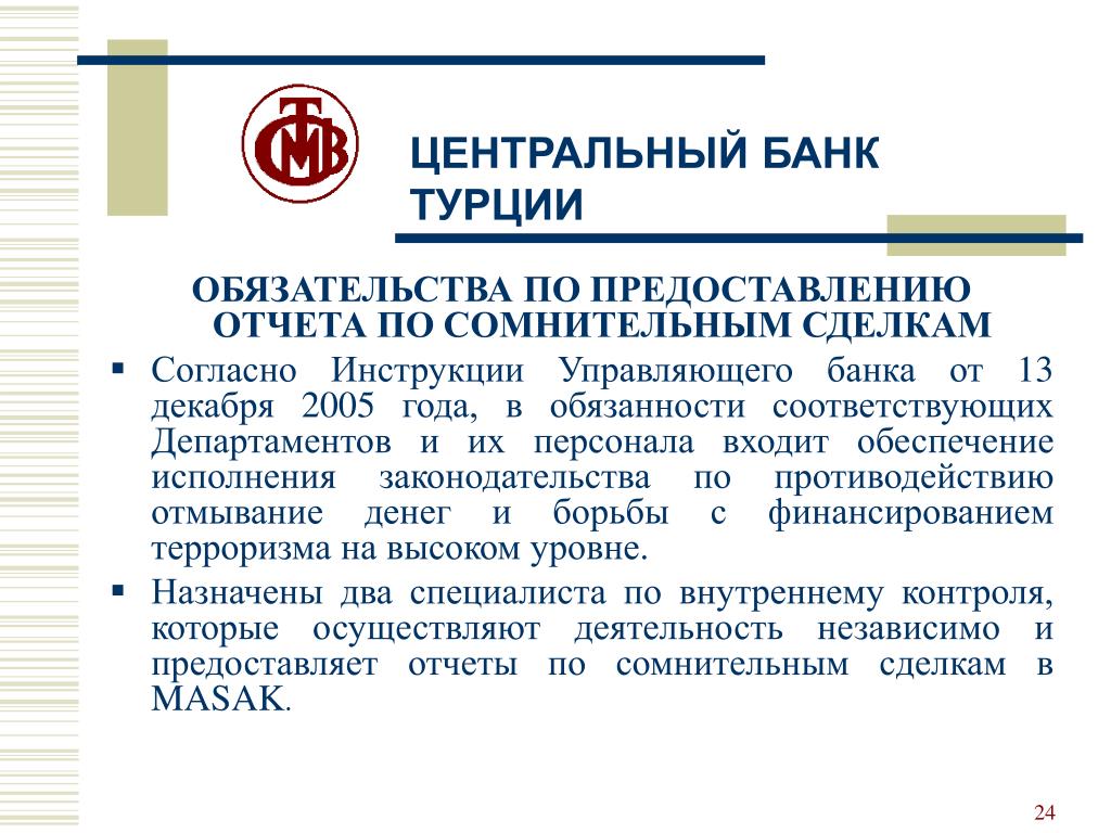 В предписаниях об установлении или изменении нормативов или состава обязательных резервных требований указываются сроки не менее одного месяца, к которым банки должны выполнить новые нормативы по составу или размеру резервов.Решение о выплате процентов по обязательным резервам принимается Центральным банком.В случае невыполнения банком правил статьи 28 о поддержании минимальных обязательных резервных требований Центральный банк взыскивает в бесспорном порядке с этого банка сумму недовнесенных средств, а также штраф в размере, не превышающем двойную ставку рефинансирования.Центральный банк вправе на установленных им условиях предоставлять банкам кредиты под залог следующих активов: золота, иностранной валюты, валютных и других ценностей, входящих в категорию международных резервов;государственных долговых обязательств и других долговых инструментов, гарантированных правительством;депонированных в Центральном банке и приемлемых для него депозитариях активов, разрешенных к купле-продаже или иным операциям Центрального банка в рамках настоящего закона;коммерческих векселей, оплата которых гарантирована банками.