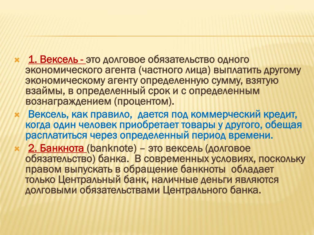 Разница между векселями и банкнотами рубля заключается в том, что банкноты и монета Банка России выпускаются центральным банком, обеспечиваются его активами (например, золотовалютными резервами) и действуют в качестве общей валюты или денежной единицы страны. В то время, как вексель — это один из видов кредитных денег — то есть денег, которые не выпускаются центральным банком, а возникают в процессе предоставления коммерческих и банковских кредитов.