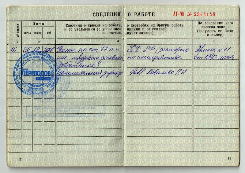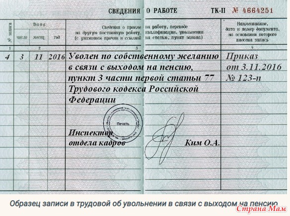 Согласно статье 77 ТК, при этом необходимо указать, что сотрудник уволился по собственному желанию.Запись о расторжении трудового договора в этом случае может выглядеть так:Она в обязательном порядке должна быть заверена подписью ответственного лица и печатью.Расчет и документы на рукиВ последний день работы организация обязана предоставить сотруднику его трудовую книжку и, при его желании, копии всех документов, связанных с рабочей деятельностью.Кроме того, работнику выдается расчетный лист, который содержит всю информацию о произведенных начислениях и удержаниях. В него также входит компенсация за неиспользованный отпуск и премия, если она предусмотрена условиями трудового соглашения.ОтработкаНе всегда сотрудникам приходится отрабатывать две недели, прежде чем уйти с работы. Если работник находится на испытательном сроке, то об увольнении он может предупредить руководство за три дня. Сотрудник, занимающий руководящую должность, должен предупредить о своем увольнении за месяц до ухода.