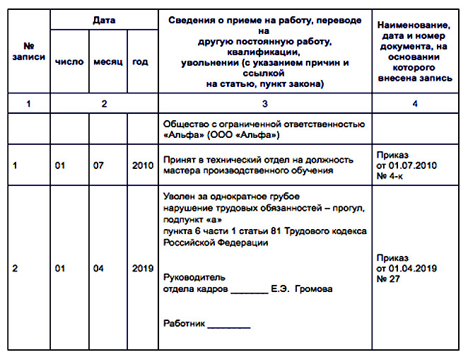 1 п. 1.1. инструкции, утвержденной постановлением Минтруда «Об утверждении Инструкции по заполнению трудовых книжек» от 10.10.2003 № 69, далее по тексту — Инструкция).