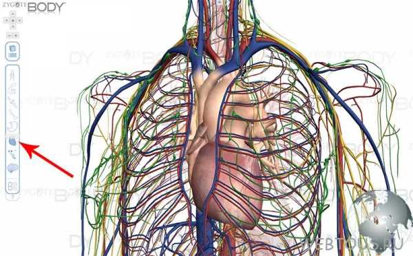 В левой части экрана есть вертикальная полоса с визуальным отображением систем в виде значков (мышцы, кости, сердце, мозг и т.д.). Переключаясь на любой из значков, на теле «обнажаются» эти системы и их составляющие. Вот, к примеру, фрагмент сердечно-сосудистой системы человека: