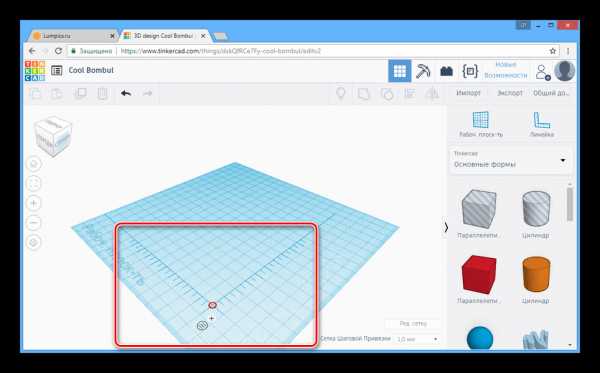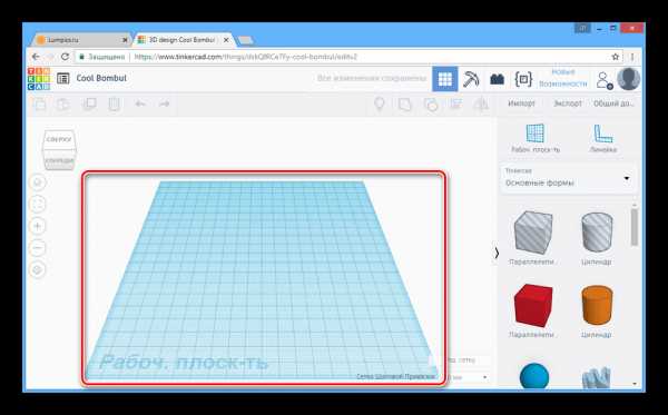 - Основная зона редактора вмещает в себя рабочую плоскость и непосредственно сами 3Д-модели.