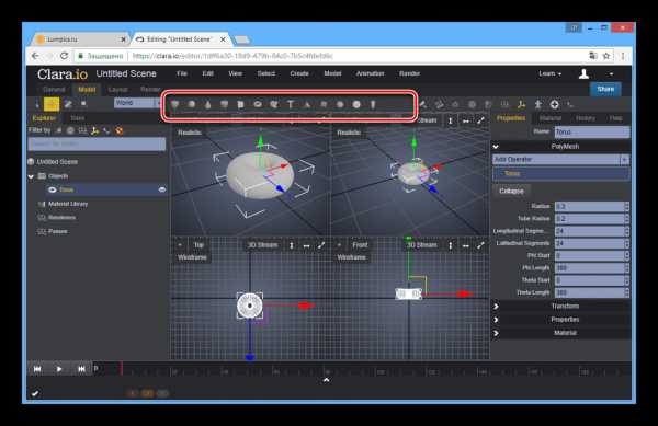 Начать работу с редактором вы можете путем создания одной из примитивных фигур на верхней панели инструментов.