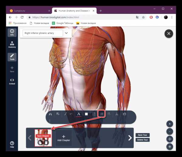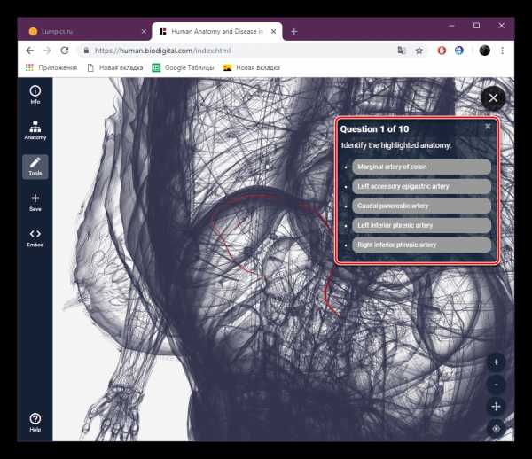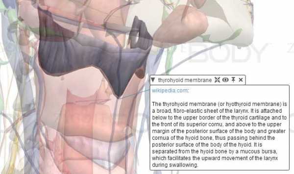 На любой части тела можно кликнуть левой кнопкой мыши, получив при этом подробное описание из википедии, скрыть на время его отображение либо поставить метку, чтобы позже к ней вернуться.