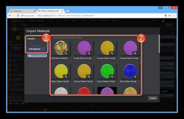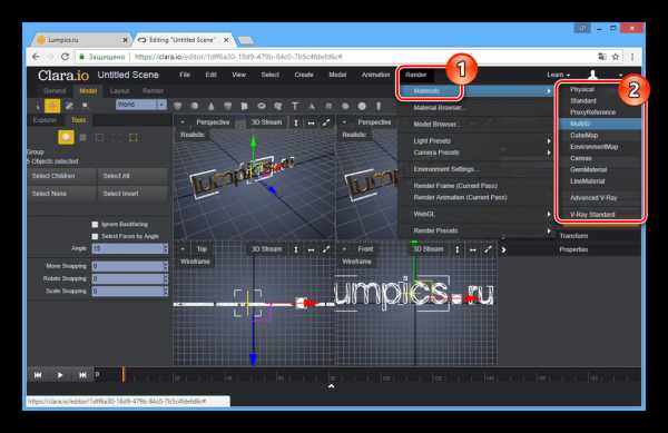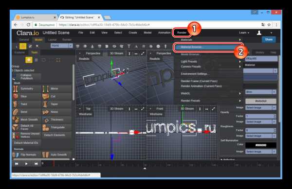 - Для изменения текстуры созданных 3D-моделей откройте список «Render» и выберите пункт «Material Browser».