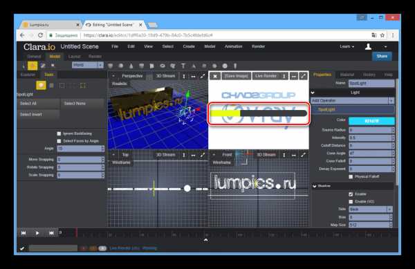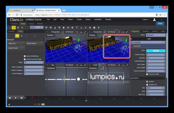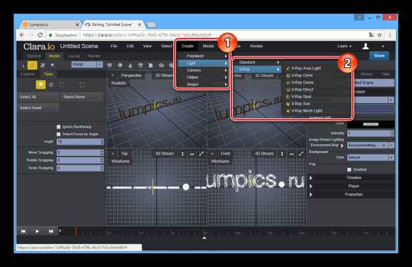 - Чтобы добиться приемлемого вида сцены, необходимо добавить источники света. Откройте вкладку «Create» и выберите тип освещения из списка «Light».