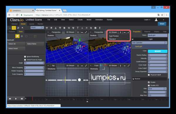 - Для просмотра финальной сцены, нажмите кнопку «3D Stream» и выберите подходящий тип рендеринга.