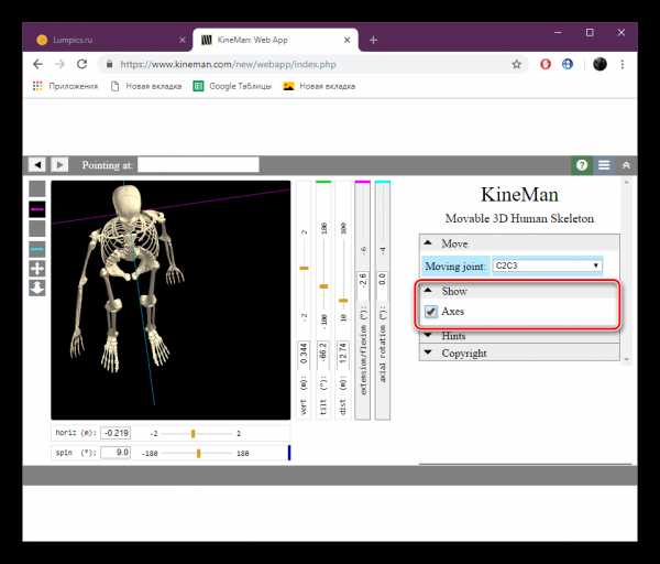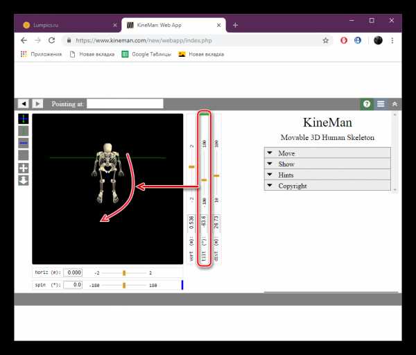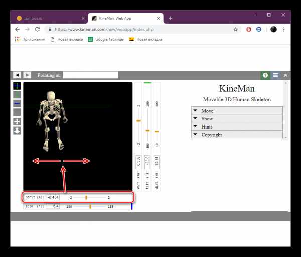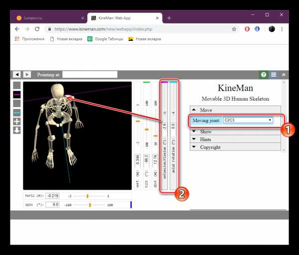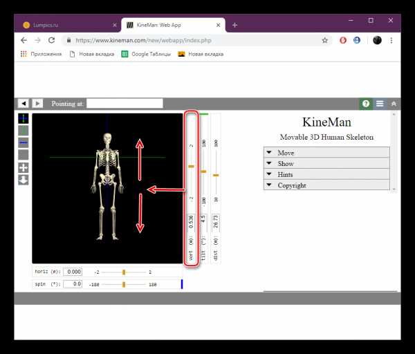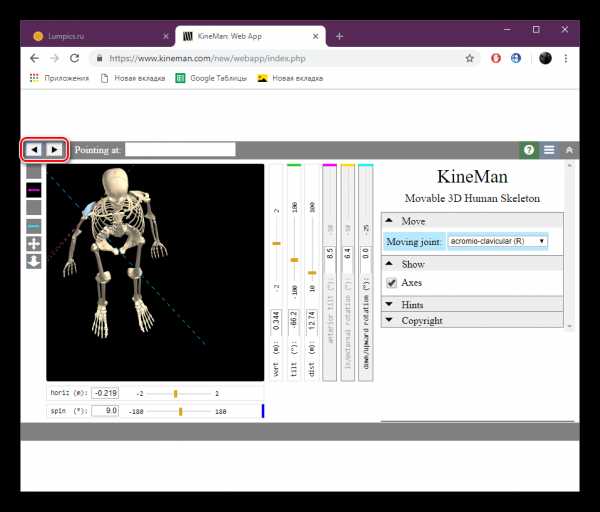 - Дважды кликните левой кнопкой мыши по одной из части скелета, чтобы отобразились ползунки управления ею. Обойтись можно и без рычагов — просто зажмите ЛКМ и водите мышкой в разные стороны.