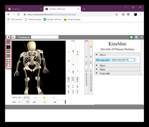 - Первоочередно внимание хотелось бы обратить на панель управления справа. Здесь осуществляется изменение масштаба и перемещение скелета по рабочей области.