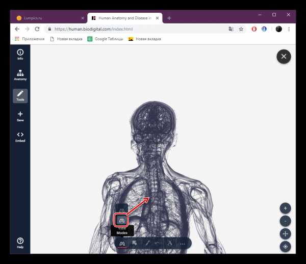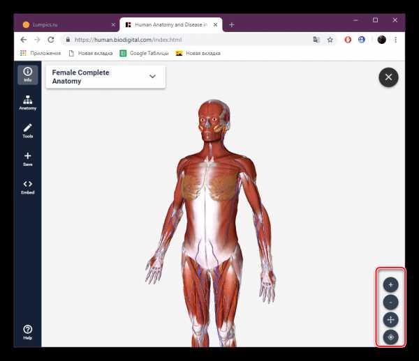 Навигация по виртуальному телу человека осуществляется при помощи мыши: ей можно приближать, отдалять, вращать, взаимодействовать с частями тела. Если нет мыши, то можно использовать набор кнопок в левом верхнем углу 3d атласа – кому-то такой вариант может показаться даже более удобным.