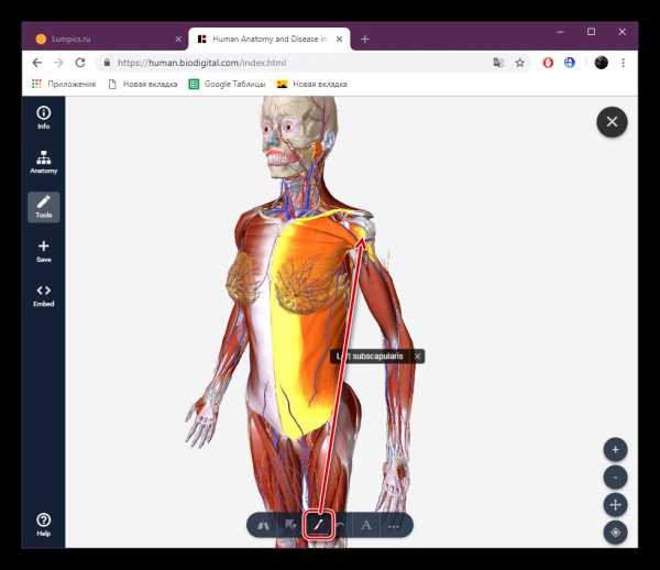 Чтобы идентифицировать часть тела, найти определенную мышцу, кость или орган, достаточно нажать кнопку мыши.